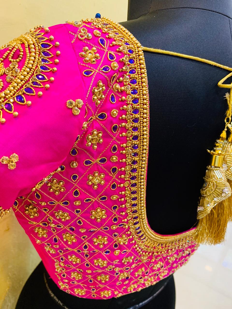 Check out this dazzling blouse with tons of crystal and stone work! The blouse is specially designed for brides to make them steal the show with this brilliant design. White stones are spread all over the blouse, and pretty blue and green stones are used for highlighting. This blouse suits almost all sarees and is worth an investment.